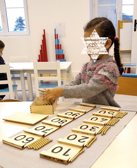 Avec le matériel Montessori, les enfants apprennent d’abord par la voie sensorielle, en manipulant du matériel concret (jetons, cubes, figurines, objets du quotidien), selon une progression qui s’adapte au rythme de l’enfant.