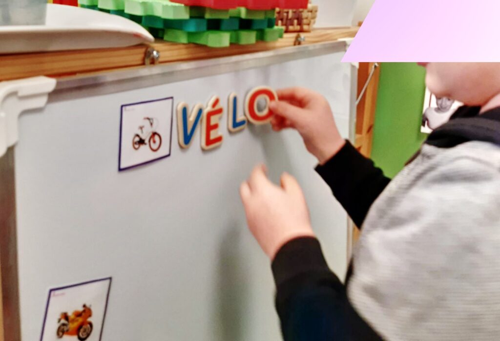 Les enfants sont familiarisés au son que font les lettres dès la petite section. Nous apprenons en moyenne une lettre par semaine et progressivement selon l’envie des enfants on peut même composer des syllabes et des petits mots. A leur rythme, les enfants peuvent encoder, puis naturellement décoder et entrer dans la lecture quand c’est le bon moment pour eux.